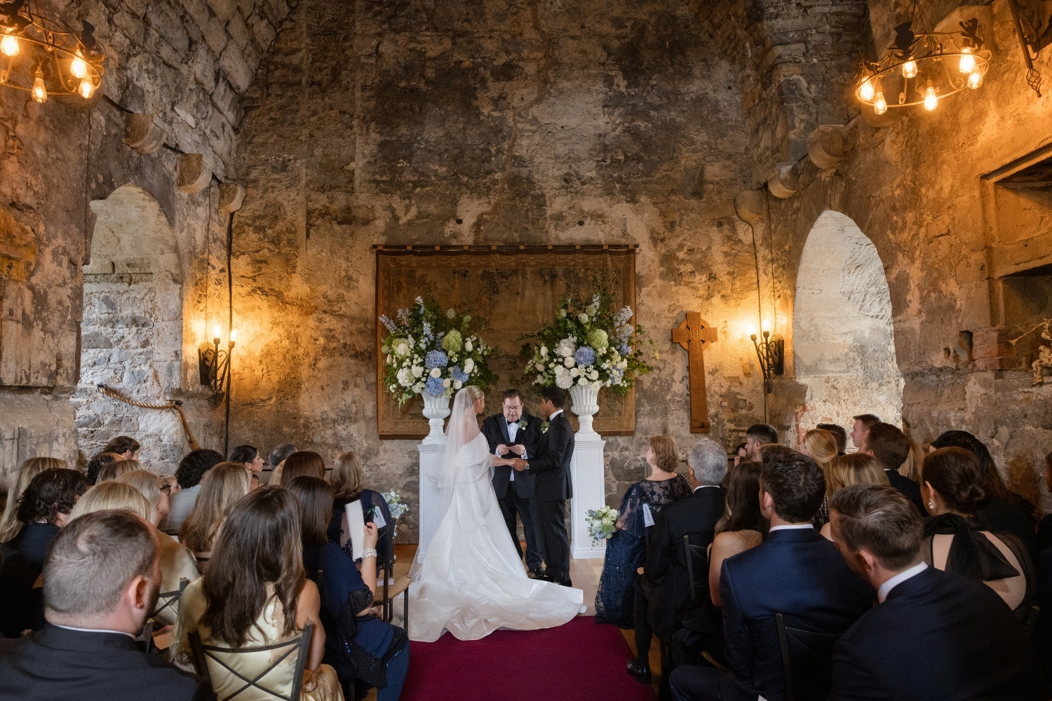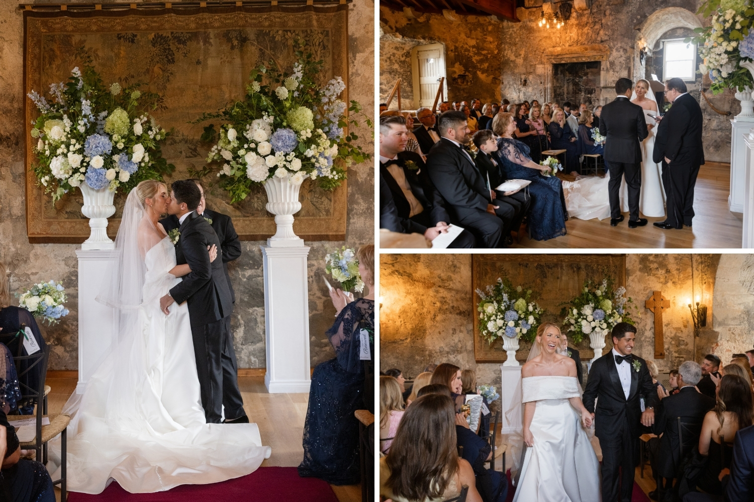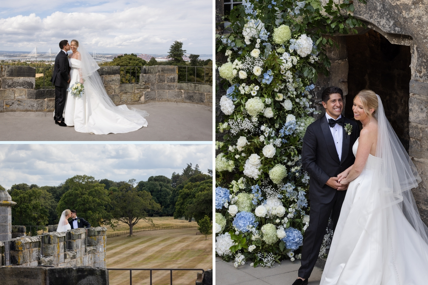 A palette of summer blues and soft whites was chosen by the couple and reflected throughout the day, from the spectacular floral arrangements in the Auld Keep, Main Hall and Pavilion, to the bridal party’s bouquets.
