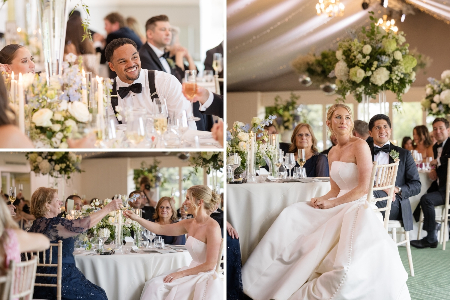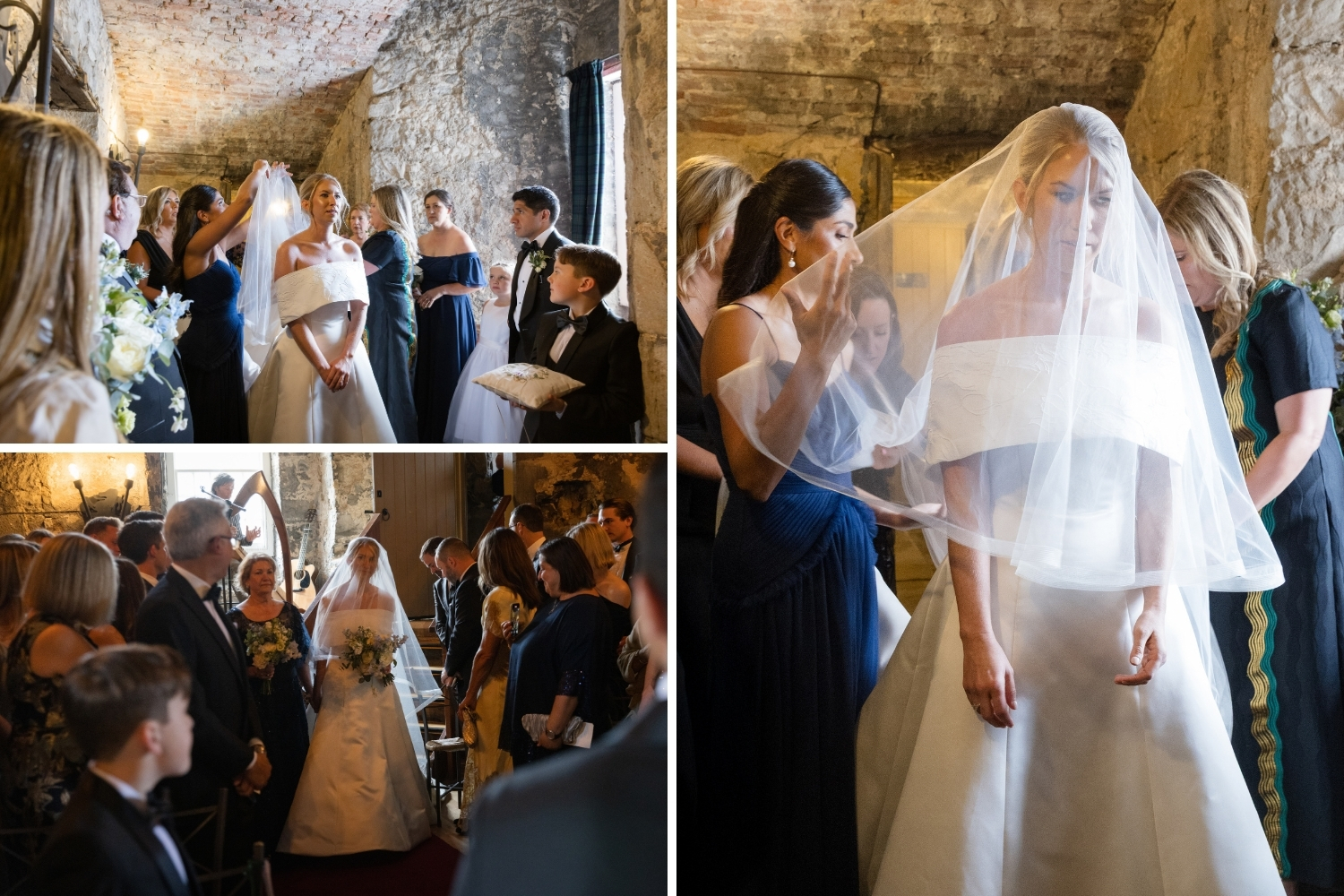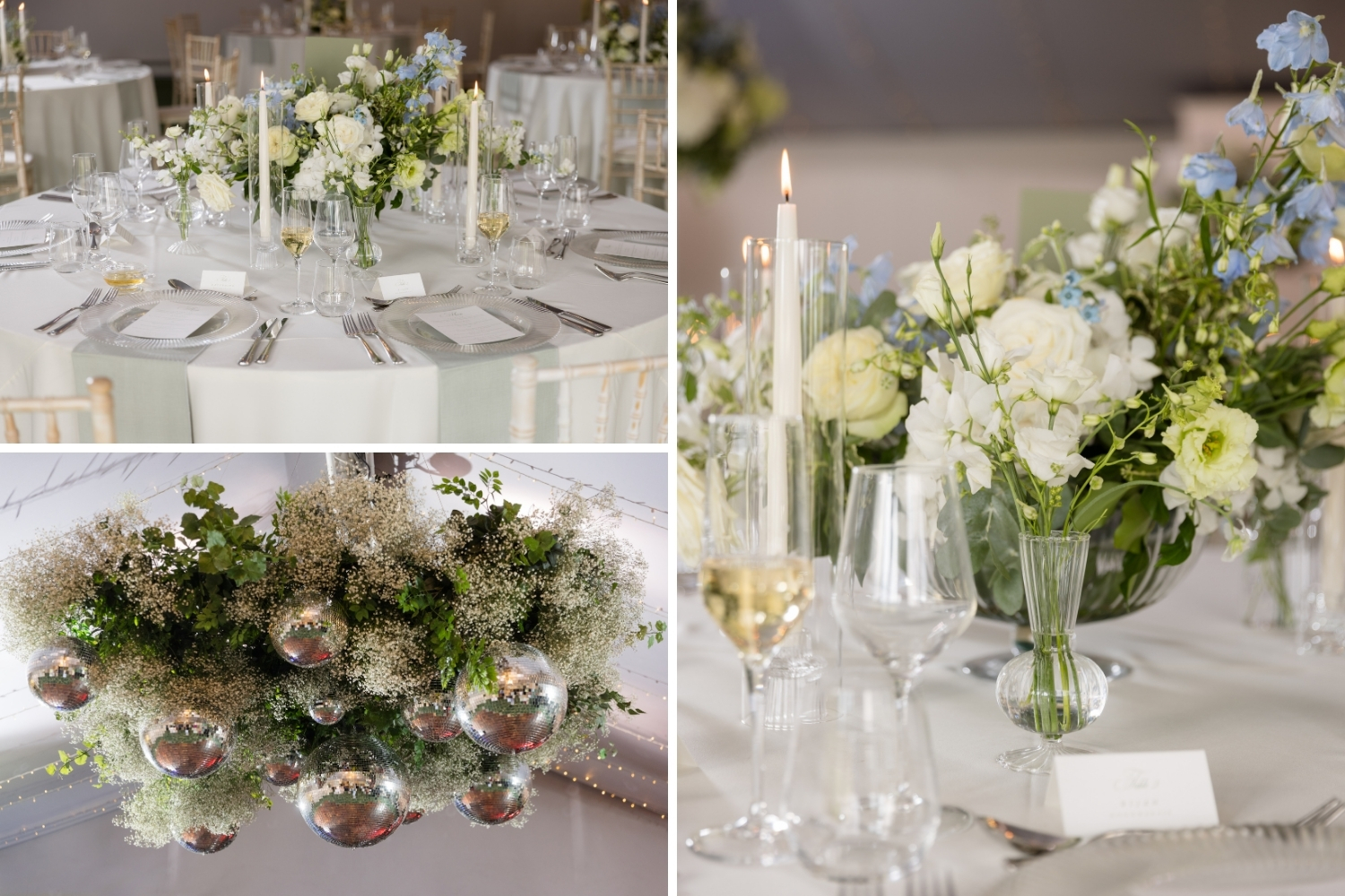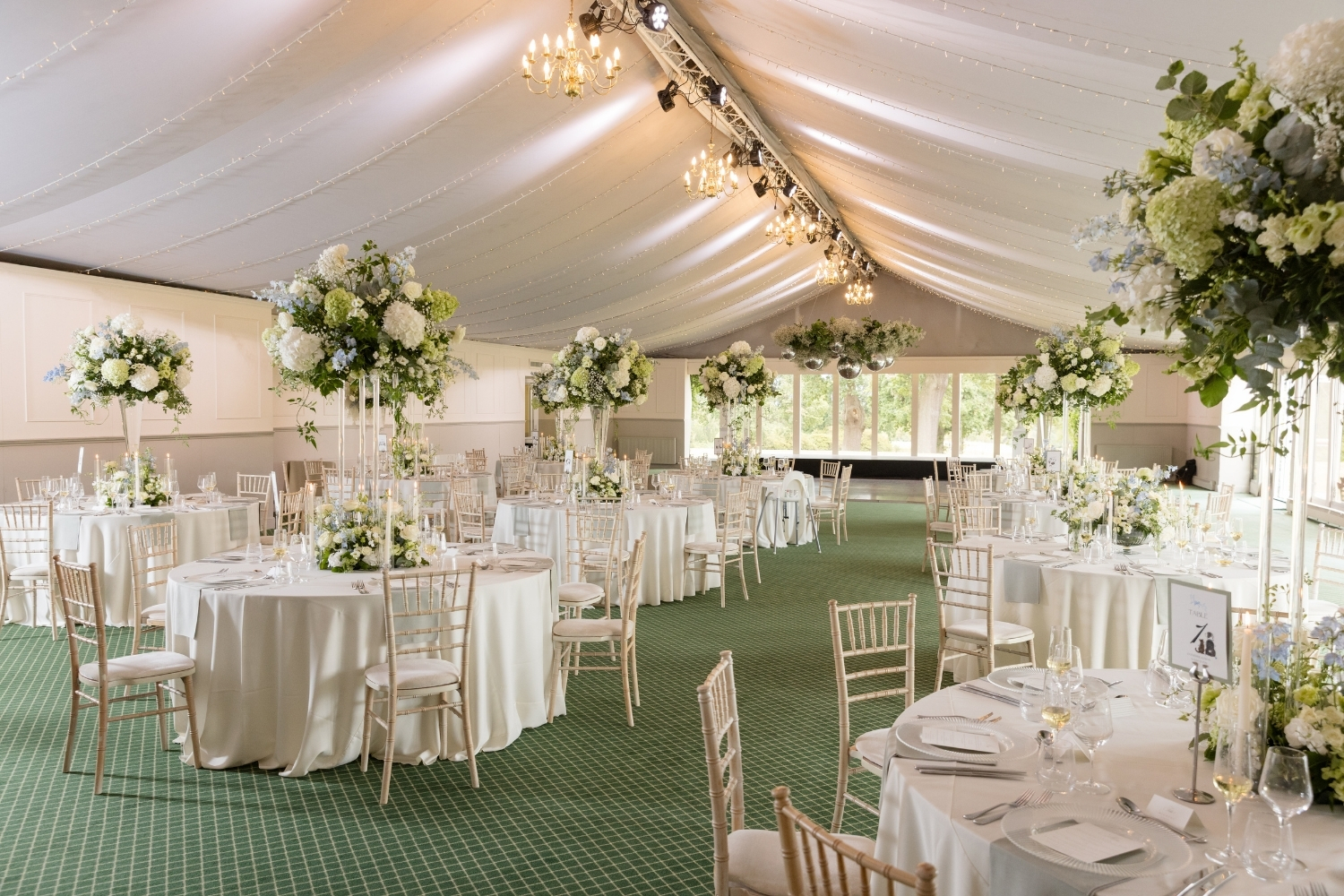 A palette of summer blues and soft whites was chosen by the couple and reflected throughout the day, from the spectacular floral arrangements in the Auld Keep, Main Hall and Pavilion, to the bridal party’s bouquets.