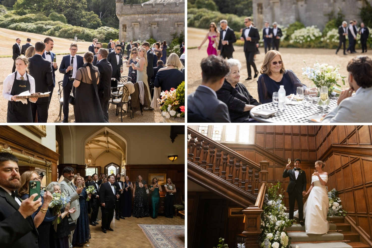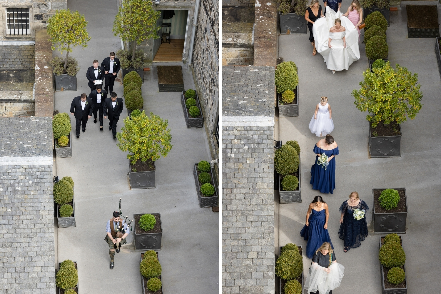 Following the ceremony, the newlyweds headed to the roof of the Auld Keep for photographs overlooking the Firth of the Forth and the iconic three bridges, while guests returned to the main Castle for the drinks reception. The newlyweds were announced to their guests and piped down the grand staircase into the Main Hall, where they joined their loved ones to celebrate and cut their beautiful three-tiered wedding cake.