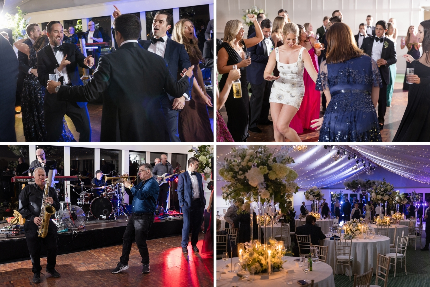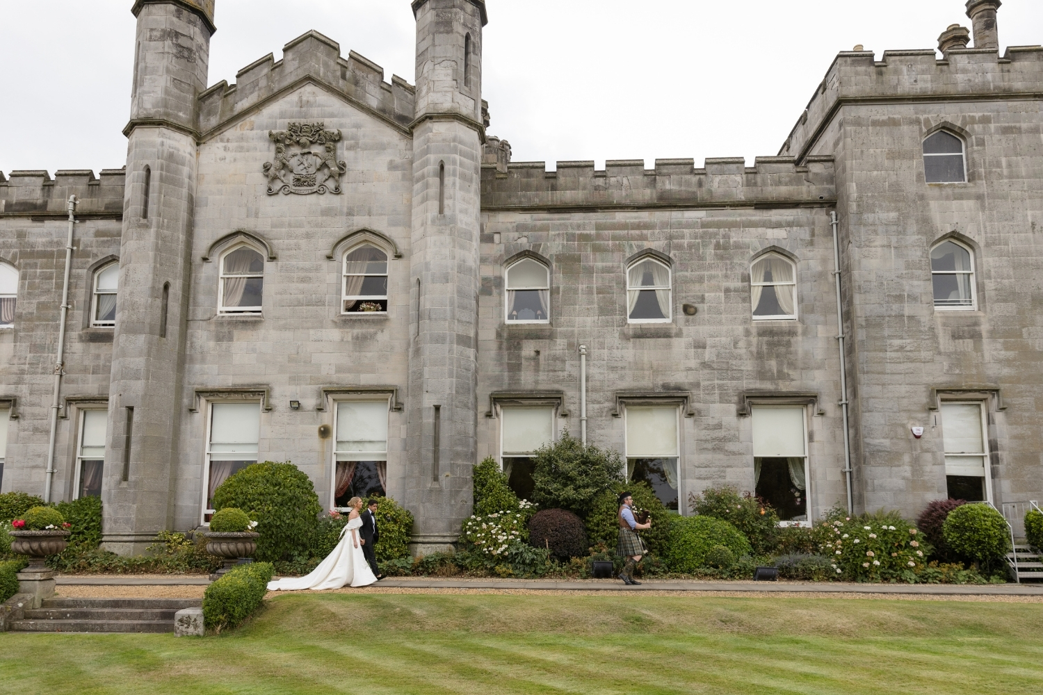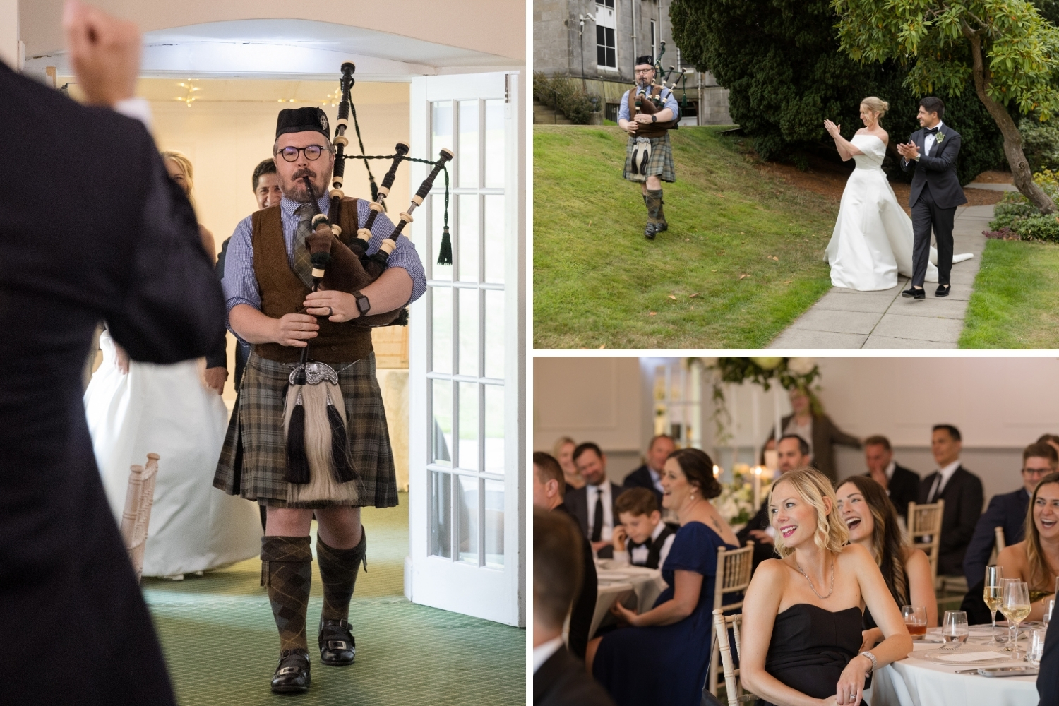 Following the drinks reception, the bride and groom, along with their guests, were piped to the Pavilion, where they enjoyed heartfelt speeches and a delicious dinner. The Pavilion was elegantly styled to complement their chosen colour palette, with statement table centrepieces featuring white and blue hydrangeas. Guests and the couple then enjoyed an evening of dancing to live music, bringing the perfect close to an unforgettable day of celebrations.