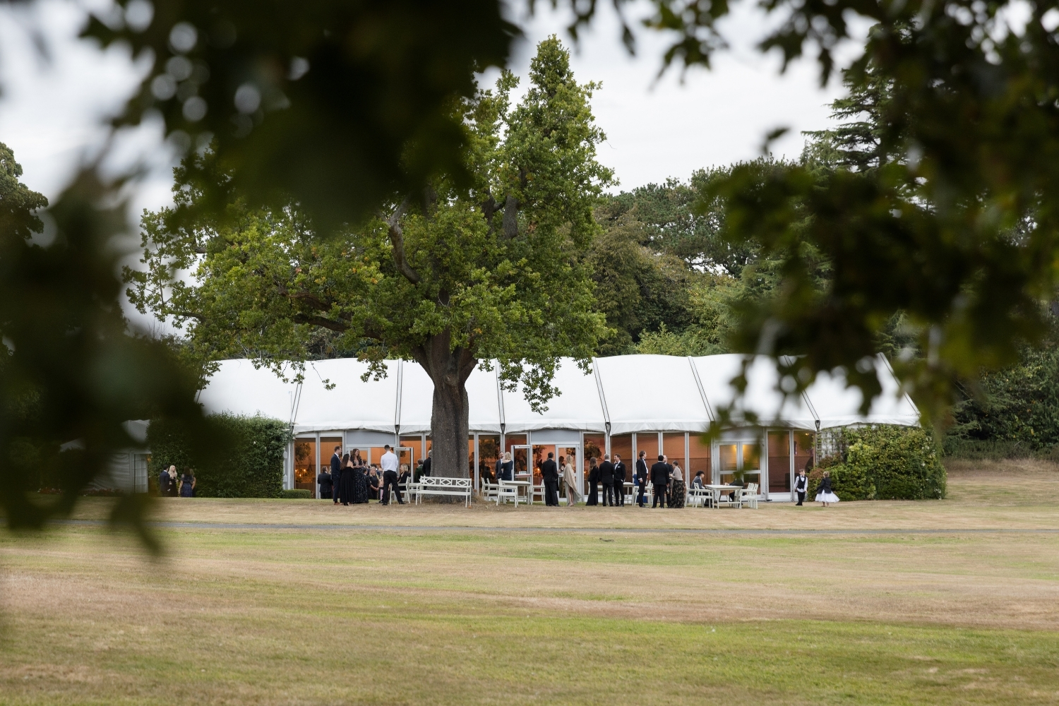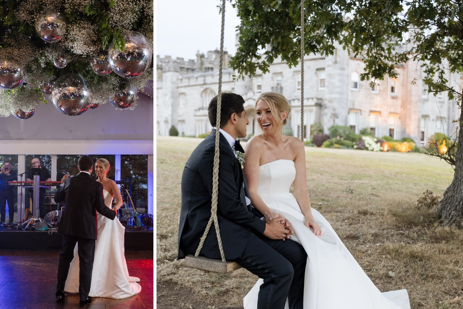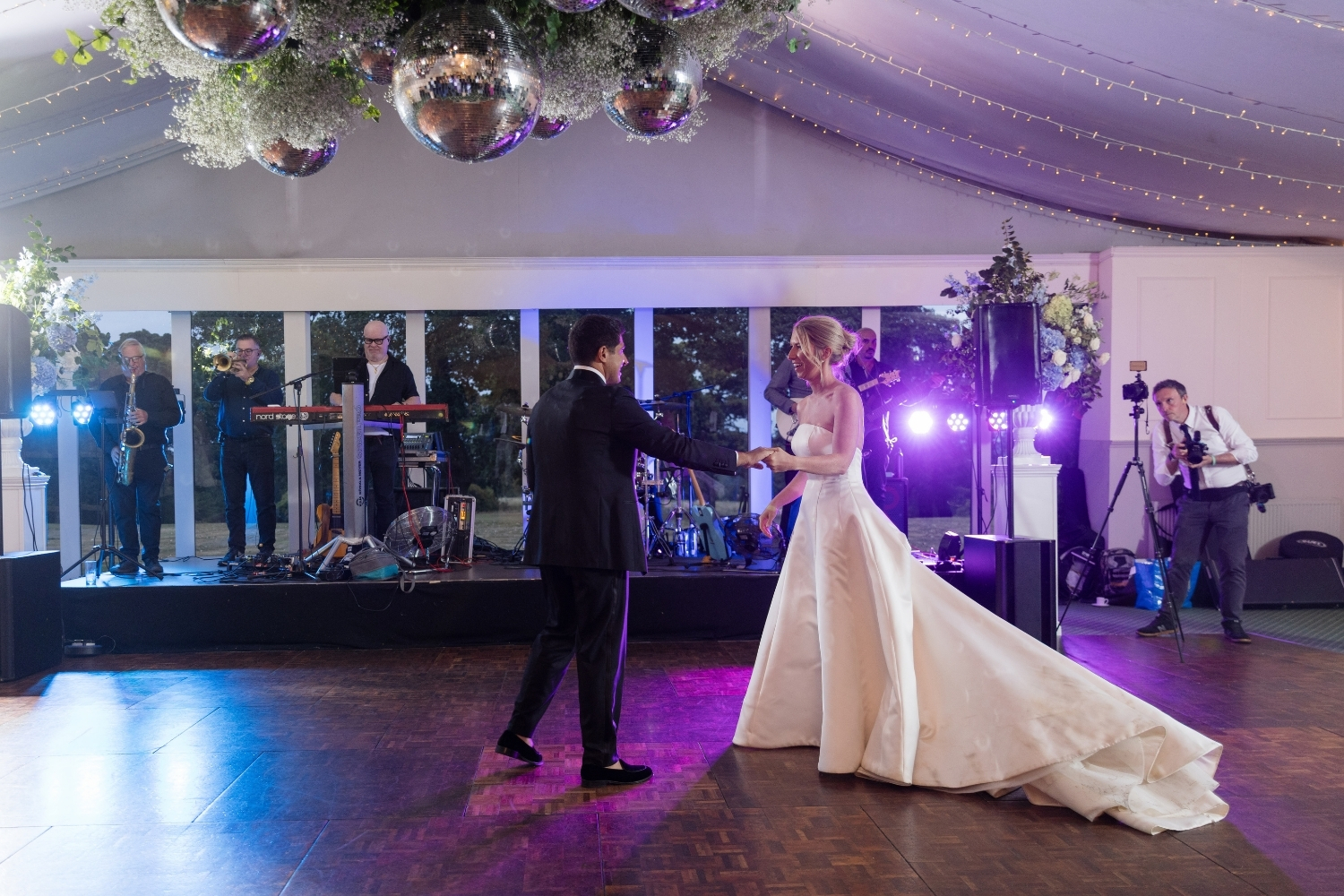 Following the drinks reception, the bride and groom, along with their guests, were piped to the Pavilion, where they enjoyed heartfelt speeches and a delicious dinner. The Pavilion was elegantly styled to complement their chosen colour palette, with statement table centrepieces featuring white and blue hydrangeas. Guests and the couple then enjoyed an evening of dancing to live music, bringing the perfect close to an unforgettable day of celebrations.