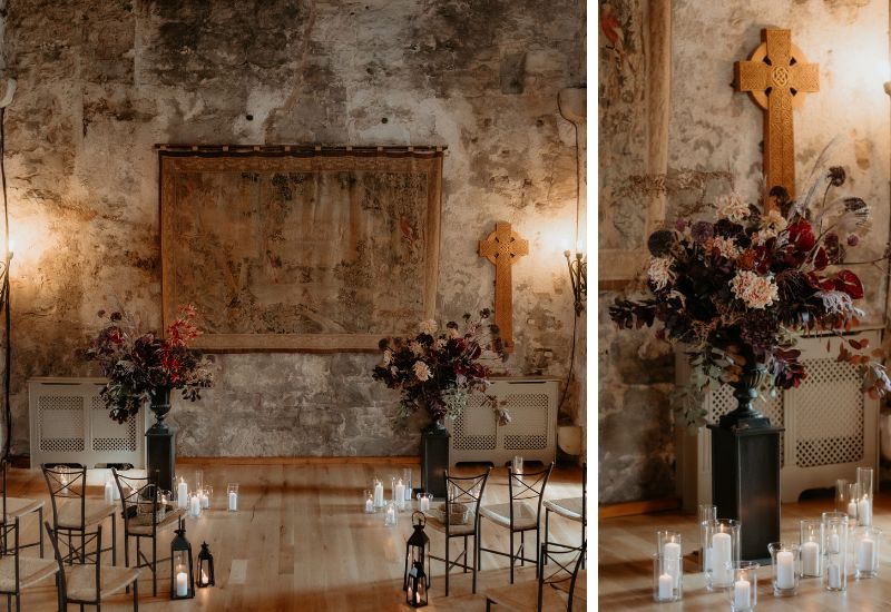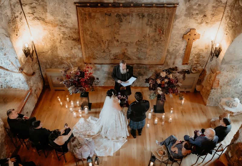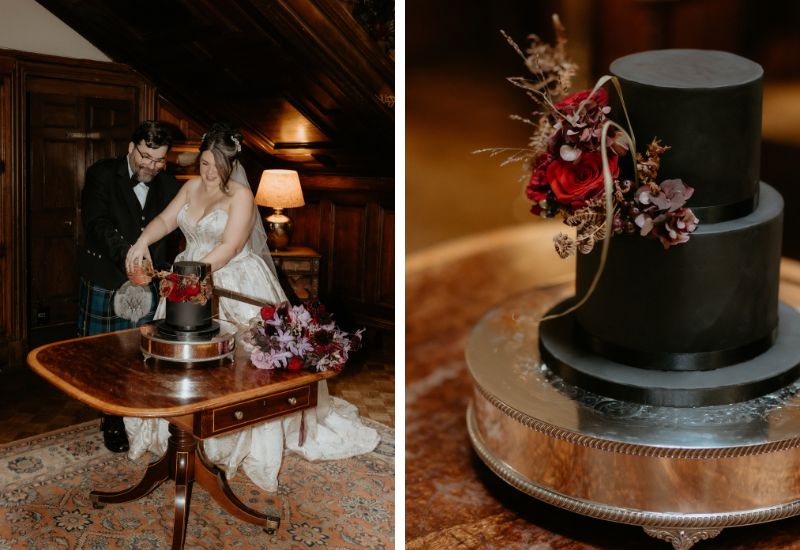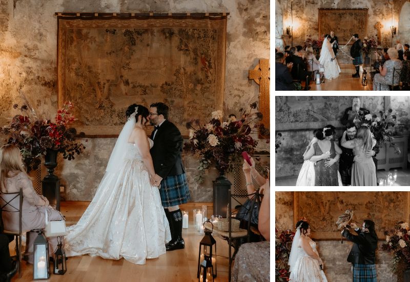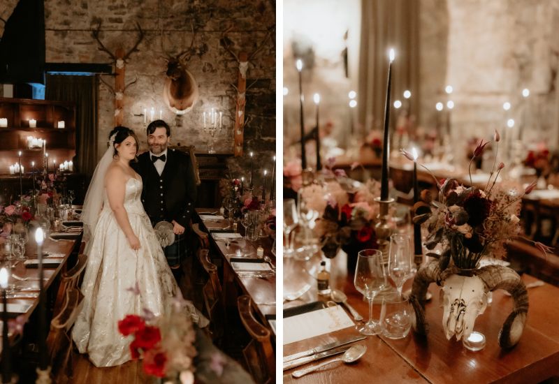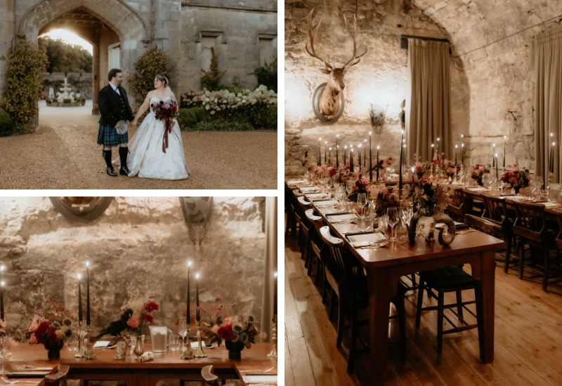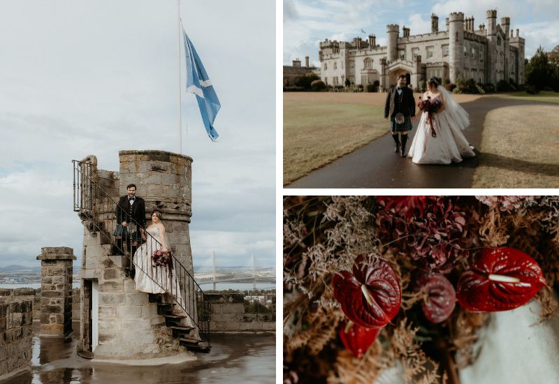 Following the ceremony, Sara and Joseph made their way to the roof of the Auld Keep, where they had photographs taken overlooking the Firth of the Forth, before rejoining their guests in the main Castle for the drinks reception and to cut their cake. Dinner was served in the Stag Chamber, which was beautifully decorated with deep autumnal purple flowers that complemented the bride’s bouquet. Celebrations continued in the main Castle with an evening of dancing and a performance by drag queen Dragarazzi.