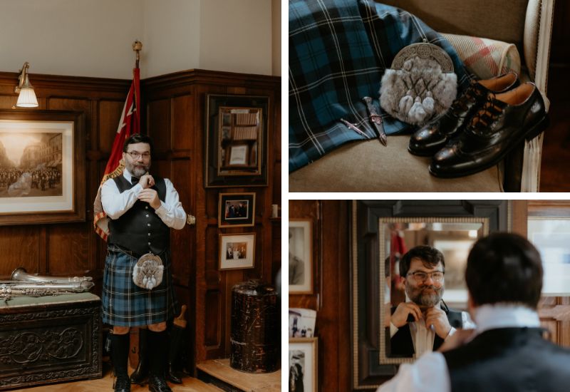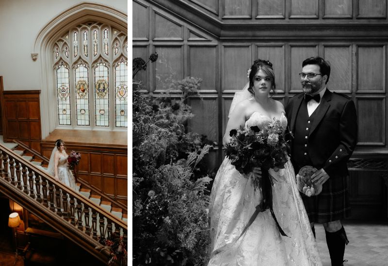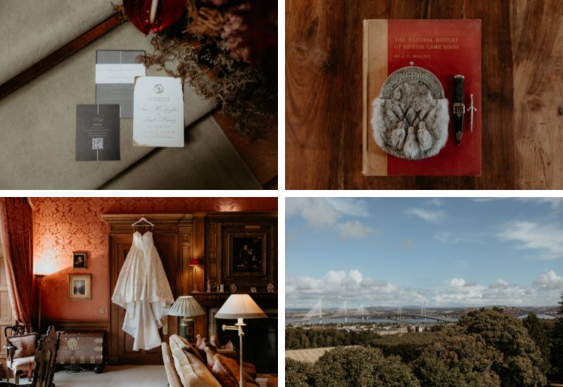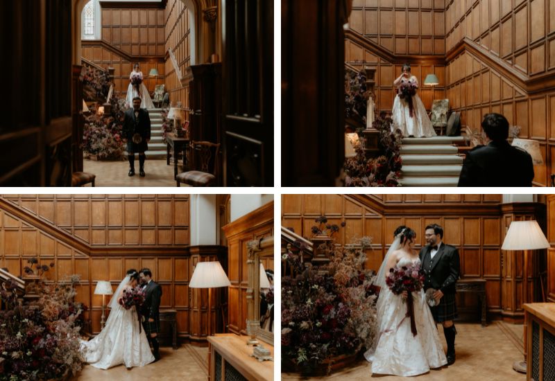 On the wedding day, events started with a relaxed breakfast in the Croquet Room. Sara began preparations before stealing a moment for a first look with her groom, Joseph, in the Main Hall. Sara and her bridal party were piped to the ceremony in the Auld Keep, where the couple embraced the Scottish traditions of handfasting and drinking from the quaich. A spectacular owl ring bearer created an unforgettable moment in their day.