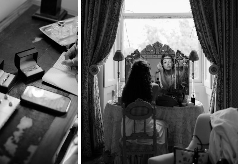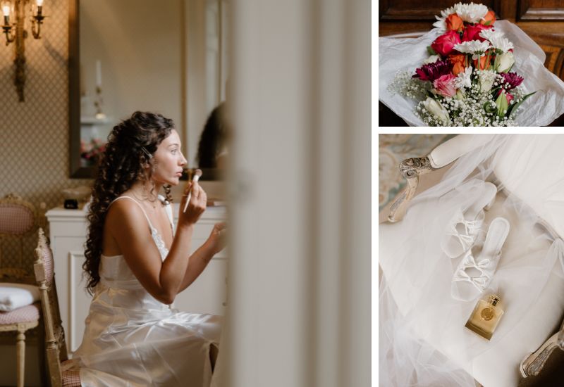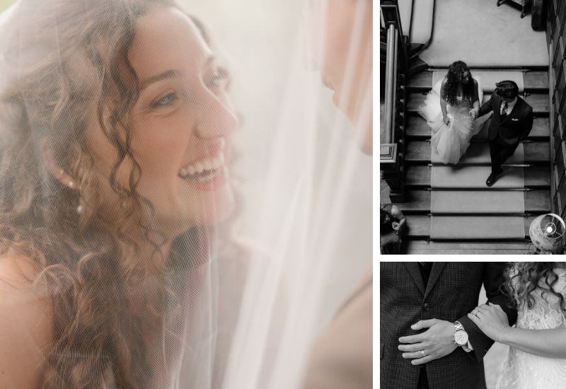 Their wedding morning was relaxed, with the bride and groom enjoying breakfast separately with their guests. Preparations for Kayla and her bridal party took place in the beautiful Winter Bedroom. Meanwhile, the groom, Zach, enlisted the help of the men to create gorgeous bouquets filled with vibrant pink, orange, and white florals for the bridal party.
